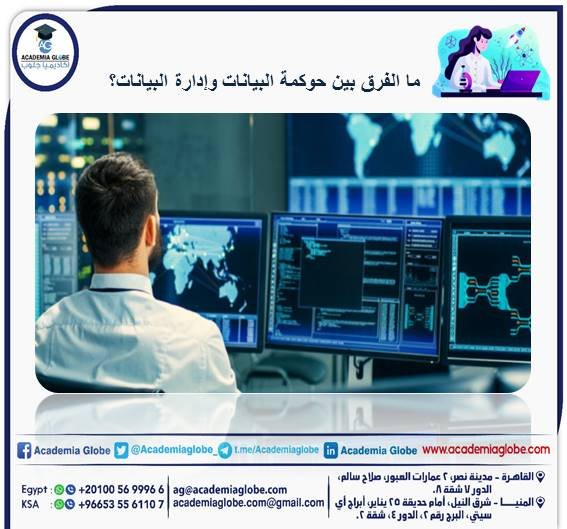 إدارة البيانات تركز على الطريقة التي تمكن المؤسسات من ربط وجمع بياناتها في مكان واحد لتسهيل إمكانية الوصول لها وتحليلها, الحوكمة تركز على التشريع والمراقبة، والإدارة تركز على التنفيذ والتأكد من التقيد بتطبيق لوائح الحوكمة وقوانينها في أنظمة المؤسسة وعملياتها.
